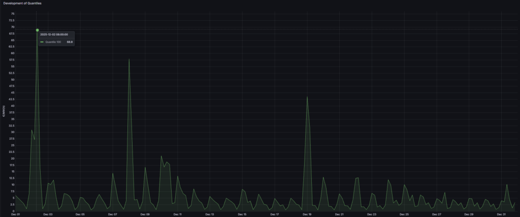 In German aFRR+, December exhibited a distinct two-phase pattern. For large parts of the month, prices stayed at a moderate level and were mostly below 50 €/MW/h. At the same time, this calm baseline was disrupted at the beginning of the month by several signifikant price spikes, which strongly shaped volatility in the first part of December.